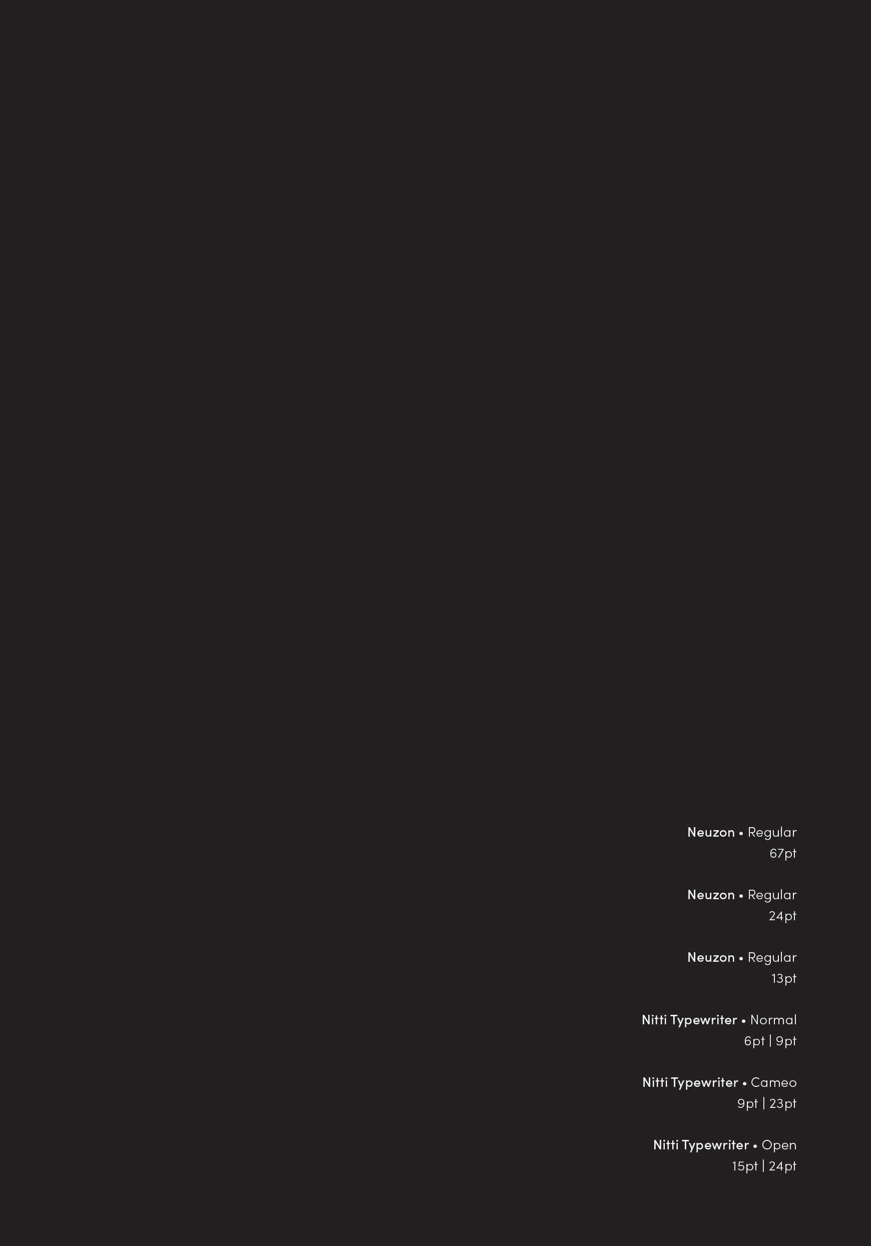 The cards are printed in a scale less than an A4 size paper and in light tan paper showing each interpretation of the text on one side, and on the other would be the typefaces employed on each piece including the type size and leading.
